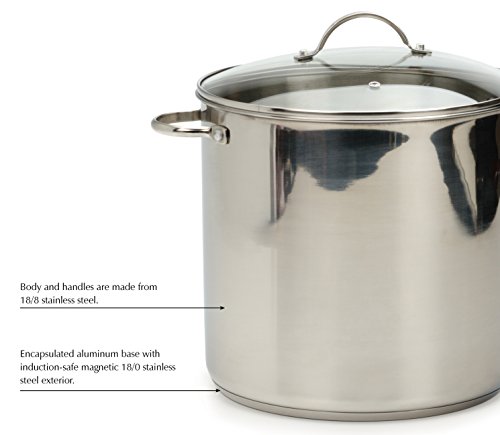 RSVP strives to offer quality kitchen products and cooking tools at competitive prices. Our RSVP 16-Quart Induction Stock Pot is the perfect example. Our stockpot is an essential tool for the well equipped kitchen. Perfect for canning, steaming, stewing, and boiling. Use it for pasta, seafood, vegetables, anything that is on the menu. This 16 quart pot is made of 18/8 stainless steel and has a thick encapsulated base with aluminum core for quick, even heat distribution. The magnetic stainless steel base makes this pot safe to use on induction cook tops. The large loop handles are riveted for strength and safety. The tempered glass lid with steam vent is oven proof to 450 degrees Fahrenheit. Pot with lid is 14-3/4-inches tall and 11-1/2-inches in diameter. Dishwasher safe. When all the right people, and ingredients, kitchen tools, and food come together, we call this The Art of Gathering.Feature
