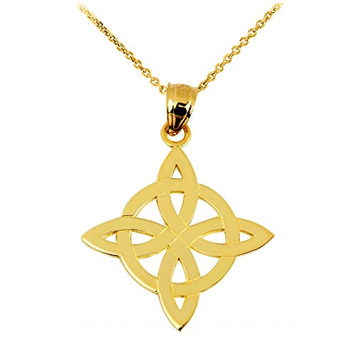 -. Feature : triangular classic Celtic knot charm pendant dangling from its dainty yet durable solid gold chain necklace / finely crafted in genuine 14 karat yellow gold in perfect polished finish / comes with free special gift packaging / made in the USA yet offered at factory direct jewelry P.R.Ice / ships from the manufacturer directly to the customers