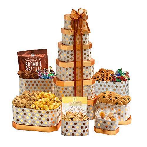 -. Feature : Great gift for birthday, thinking of you, or any occasion / Perfect gift basket for family and friends, or as a corporate office gift. / Gift tower includes: Assorted Milk Toffees, Salted Caramel Pretzels, Fruit Flashers, Blueberry-Greek Yogurt Cookies, Gourmet Caramel Popcorn, Brownie Brittle-Salted Caramel, Caramel Popcorn, Chocolate Chip Cookies, Peanut Crunch, Soft Vanilla Caramels / GIFT BASKET DIMENSIONS: 8 x 5 x 18 high / Kosher Certified OK D. Giving a kosher gift ensures that all recipients can enjoy and partake in your gift.