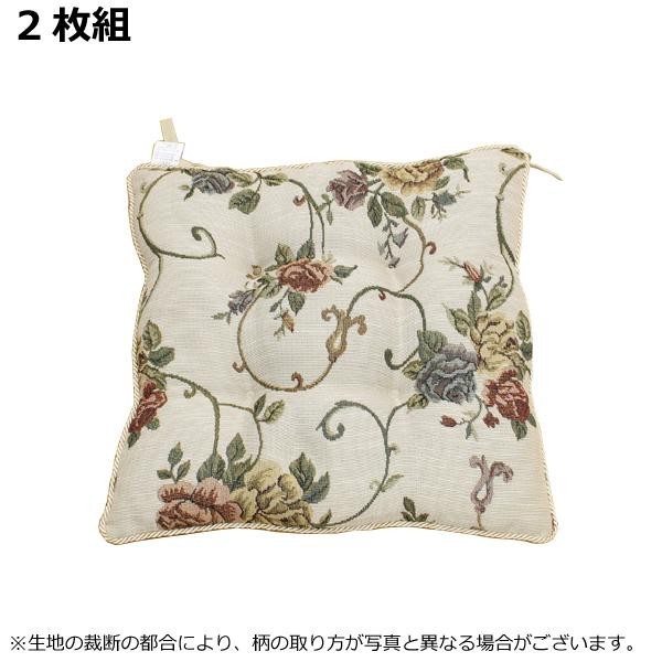 花柄が上品なクッションです。表地にはジャガード織の生地を使用しているため繊細な柄と上品な風合いが特徴です。 生産国:日本(側地:中国、最終加工:日本) 素材・材質:表地・中材:ポリエステル100% 仕様:手洗い可(洗濯機使用不可) ※サプライヤー直送品 ご注文後3~4営業日後の出荷となります【商品名】シートクッション ひも付き 『モーリア』 アイボリー 約43×43cm 2枚組 9262790