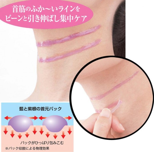 | フェイスケアはしっかりしていてもついつい手を抜きがちになるネックライン。気がつけば年輪のようにふか~いラインがクッキリ…なんてことにも。そんなお悩みには「藍と紫根の首元パック」。エイジングケアで話題の「藍エキス」「紫根エキス」をたっぷり配合した紫色のパックを気になる首元のラインにピーンと貼りつけ集中ケア! |