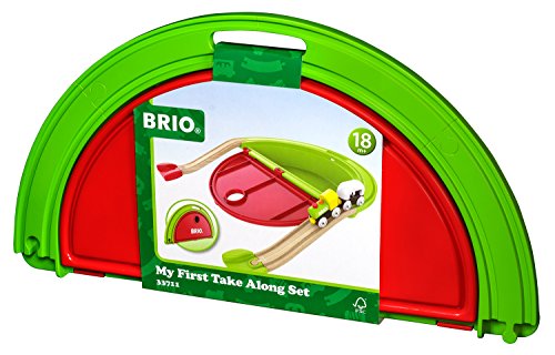 Now even the littlest conductors can play with trains anywhere! Designed for toddlers 18 months and older, My First Take Along Set was made for on the go fun. Simply open the special carry-along case, and start your engines. Chunky plastic connector pieces help little hands guide the train onto the tracks, and train car polarity swivels so that cars can be easily attached in any direction. When it's time to go, the train packs and stores neatly in its carry case. Includes My First Engine with bell wagon, train tracks, two patented ramps and carry bag with handle. Additional curved tracks are built into the case and compatible with all BRIO railway sets. BRIO creates innovative, high-quality and well-designed toys with clean, simple designs that spark children's creativity and imagination while encouraging and supporting each stage of their development. For over a century, our mission has been to create happy childhood memories. All wooden parts are made from 100% FSC-certified beech wood from sustainably managed forests and are built to last for generations.Feature
