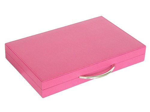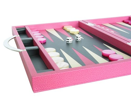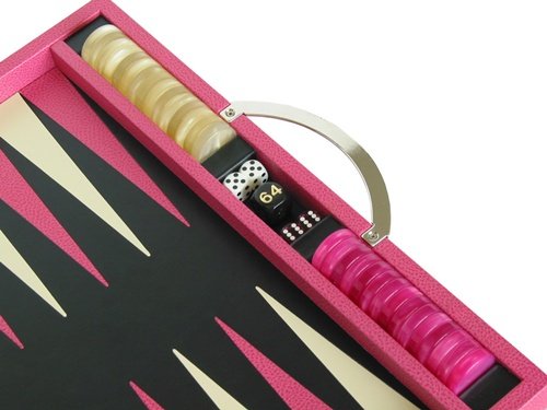 From one of the premiere design houses in Italy, GammonVillage is proud to present the Zaza Sacci series of luxury backgammon boards. This gorgeous pink leather travel sized backgammon board is the perfect embodiment of high quality materials and superior craftsmanship you can expect in every Zaza Sacci product. Finished in the highest quality Dollaro leather and with immaculate inlays on the playing surface, this backgammon board is destined to become a family heirloom for generations to come. In every Zaza Sacci backgammon game, you can expect superior finish and construction. This compact travel sized backgammon set closes firmly with a nickel-plated magnetic clasp. What would such a quality backgammon board be without tournament sanctioned precision dice to top it all off? Every Zaza Sacci backgammon board comes with precision dice, so you'll be 100% ready for backgammon tournament action. Additional Details Closed Case: Length: 15 1/4", Width: 9 3/4", Height: 2 1/2"; Open Case: Length: 15 1/4", Width: 19 5/8", Height: 1 1/4"; Exterior: Leather; Playing Surface: Inlaid Leather; Nickel Plated Magnetic Clasp; High Gloss Mother of Pearl Pink and Ivory Stones: 1 3/16" diameter, 5/16" thick; 2 Sets of Fuschia Pink and Opaque White Dices, and a White Cube 0 |