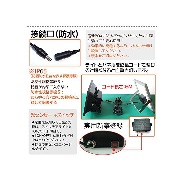 세트 내용:라이트 본체 고, 솔라 패널,5m접속 코드,충전지*3개,일본어 취급 설명서 주의:어두워지면 자동 점등합니다.솔라 패널이 빛을 감지하면,점등 할 수 없습니다.본 제품은,장시간 점등 타입 이기 때문에,배터리 용량이 일정 이하가 되면 밝기가 저감하는 사양 입니다.