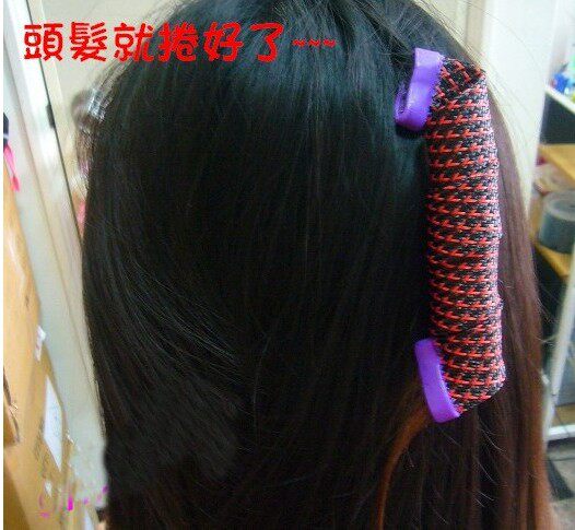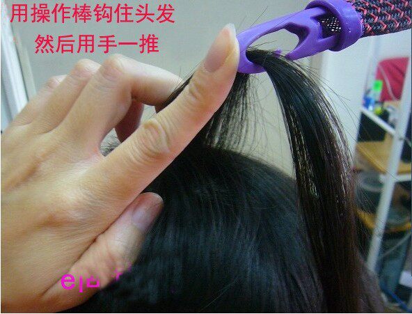 2、开始上卷发器。用操作棒先勾住头发,再用手一推,头发就会卷进去啰!