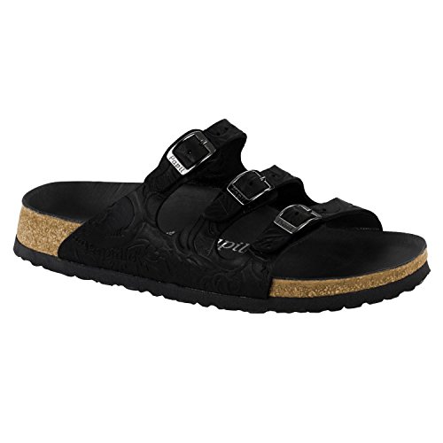 Studio : Papillio Publisher : Papillio Binding : Apparel Product Description Offering security and style the Florida slide sandals for women from Papillio by Birkenstock are a great addition to your sandal collection this summer. These strappy sandals are made using a greasy leather upper with a relief texture and feature three adjustable straps with buckle closure to easily get that perfect fit.The nappa leather lined anatomically correct natural cork footbed moulds to the shape of your foot creating a custom footbed to cradle and support each and every step you take.The raised toe bar is designed to encourage the natural gripping motion of your feet aiding with circulation. The neutral heel profile and deep heel cup of these open back sandals is distributing your body weight more evenly maintaining a natural posture while walking.These beautiful narrow fit sandals feature a EVA outsole which offers lightweight, shock absorbing support with lasting durability. Made in Germany. 0