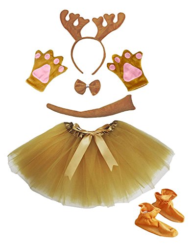 -. Feature : product includes: headband, bow tie, tail, pair of paws, tutu, shoes / lightweight polyester material / sested for 2-5 years girl / adjustable covered waistband / brown reindeer costume for children