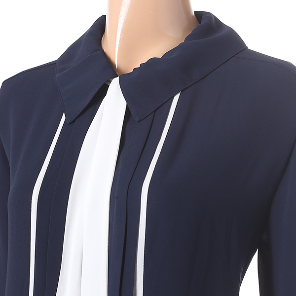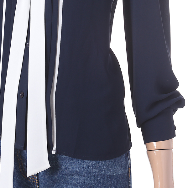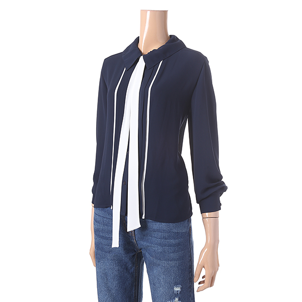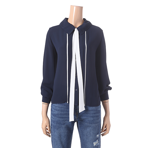 네이비 색상의 배색 리본 장식이 돋보이는 블라우스 입니다. 핀턱 주름 디테일로 여성스럽고 세련된 이미지를 연출해 줍니다.폴리에스터 소재로 가볍고 부드러운 착용감을 느낄 수 있습니다. 슬랙스나 스커트등과 매치하여 베이직하고 고급스러운 스타일을 완성할 수 있습니다.긴팔셔츠 사이즈 (cm)