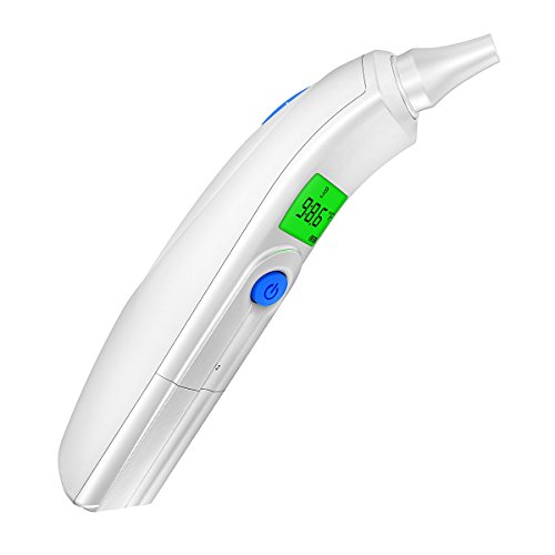 -. Feature : ✅ FAST READING: Latest infrared technology is adopted to measure inner body temperature via ear canal, showing temperature result in just one second on large easy-to-read LCD Backlit Screen; an ideal clinical digital ear thermometer for early detection of fever. / ✅ HIGH ACCURACY: Intelligently grab and analyze test results with highly sensitive built-in sensor, measuring temperatures with perfect accuracy of ±0.2℃(0.4℉). / ✅ MEMORY FUNCTION: Up to 19 groups of latest measurement results are memorized so that you can compare and track the fever; audible Bi Bi alarm for fever when above 100.4℉(38℃). / ✅ EASY OPERATION: Compact, lightweight and ergonomic design; operate with just one touch of button; ℉/℃ switchable; auto power off in 30 seconds to conserve battery power. / ✅ SAFE & RELIABLE: All meet FDA 510k standard in the United States; the probe tip is waterproof for easy cleaning; perfect for infants, toddlers & adults or professional clinical diagnosis.