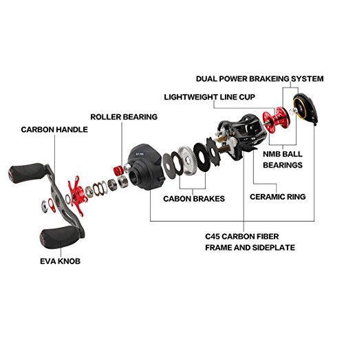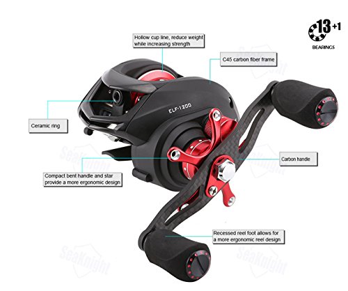 -. Feature : SeaKnight ELF baitcasting reel is centrifugal & magnetic 2 brake systems / Carbon handle 21% lighter than aluminum / Gear ratio 6.4:1. Max Drag 4Kg. Line Capacity 0.33mm-100M / C45 Carbon Fiber Frame And Sideplate Make It a 169g Light Weight / 13 Stainless Steel Ball Bearings + 1 Roller Bearing Provides Smooth Operation