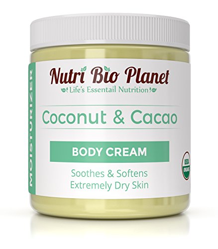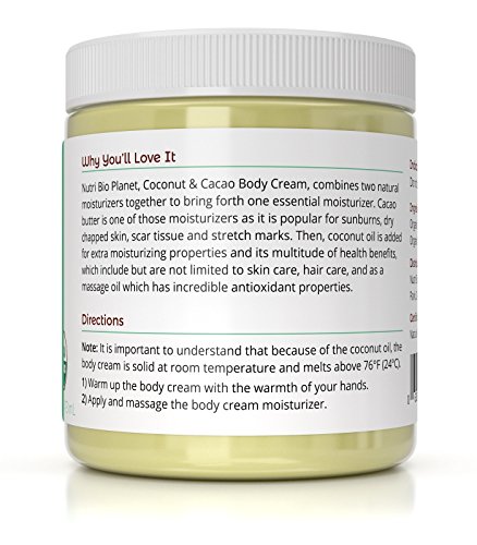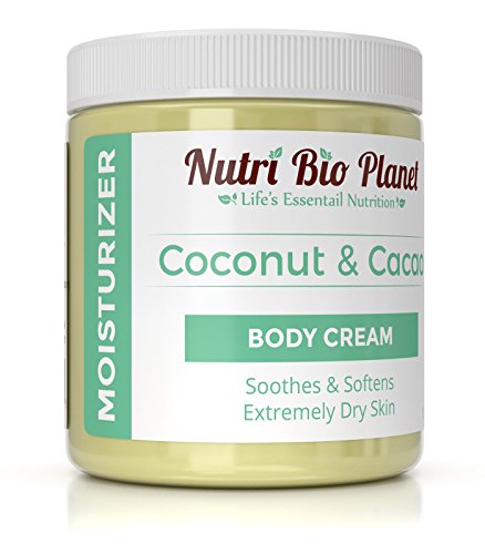 -. Binding : Grocery -. Brand : NutriBioPlanet -. Feature : Soothes & Softens Extremely Dry Skin / Made From Organic Unrefined Coconut Oil & Cacao Butter / Cacao Butter Can Use For Sunburns, Dry Chapped Skin, Scar Tissue and Stretch Marks / Coconut Oil Can Protect Hair Against Damage, Moisturize Skin and Function as Sunscreen / Melts at 76°F (24°C) and may ship to you in solid or liquid form. It is still safe to use if it is liquid or solid -. IsAdultProduct : 0 -. Label : Nutri Bio Planet -. Manufacturer : Nutri Bio Planet -. PackageQuantity : 1 -. ProductGroup : Grocery -. ProductTypeName : GROCERY -. Publisher : Nutri Bio Planet -. Studio : Nutri Bio Planet -. Title : NutriBioPlanet Coconut Oil & Cacao Butter Body Cream Moisturizer