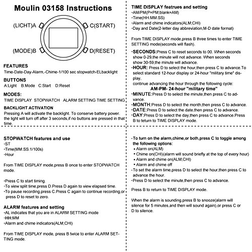 Features : Time-Date-Day-Alarm-Chime-1/100 sec stopwatch-EL backlight.