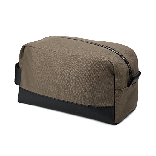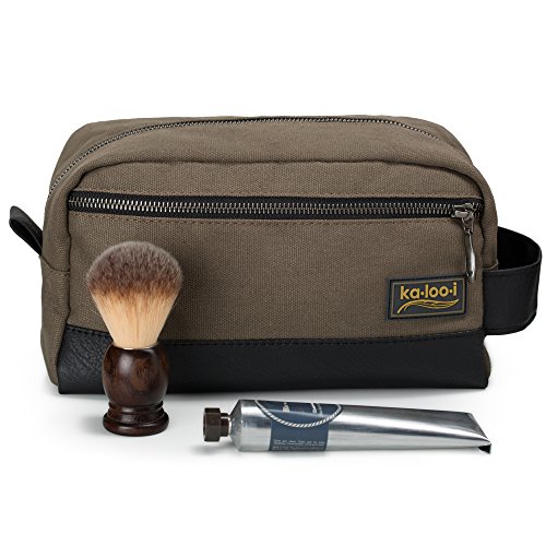 -. Title : Toiletry Bag for Men: Canvas Dopp Kit for Travel, Gym, Grooming & Shaving, Waterproof Lining, 10" x 4.5" x 5.5", Olive Green with Vegan Leather Trim, Comes with Bonus Pumice Stone & Gift Box by Kalooi