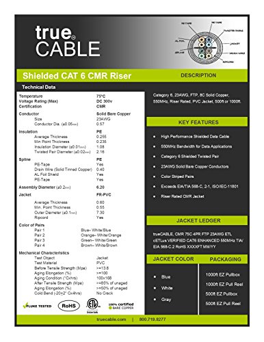 HIGH PERFORMANCE DATA CABLE. This riser rated cat 6 network cable is 23 AWG with 4 pairs (8C). The overall aluminum (AL) foil shield helps eliminate cross-talk and outside interference. Suitable for Fast, Gigabit, and 10-Gigabit Ethernet. Supports bandwidth of up to 550 MHz.
