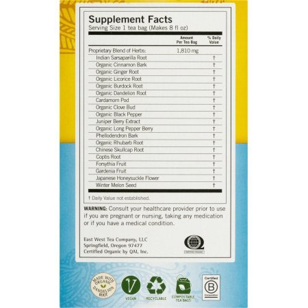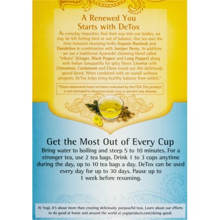 Studio : Yogi Publisher : Yogi Binding : Health and Beauty Product Description Get started on the new you with Yogi DeTox Tea Bags. This delicious and warming tea is a great way to help your body get clean from the inside out, and can help restore balance to your body. The Yogi tea bags, 16-count, can gently help the body to cleanse itself by supporting the functions of the liver and the kidneys. The bags contain purifying herbs, including burdock and organic dandelion, to promote the health of the liver, along with juniper berry to elevate kidney function. These caffeine-free tea bags also use a traditional cleansing blend of herbs that includes ginger, black pepper, long pepper and Indian sarsaparilla. The tea has a mild flavor with just a little bit of spice, for a complex and appealing flavor and aroma. Use this beverage along with an overall wellness program to get the best benefits. The Yogi DeTox Tea Bags come in a box of 16 bags, so you can have some every day and feel the difference. 0