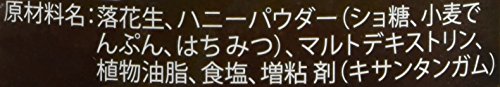 原材料:落花生、ハニーパウダー(ショ糖、小麦でんぷん、はちみつ)、マルトデキストリン、植物油脂、食塩、増粘剤(キサンタンガム)