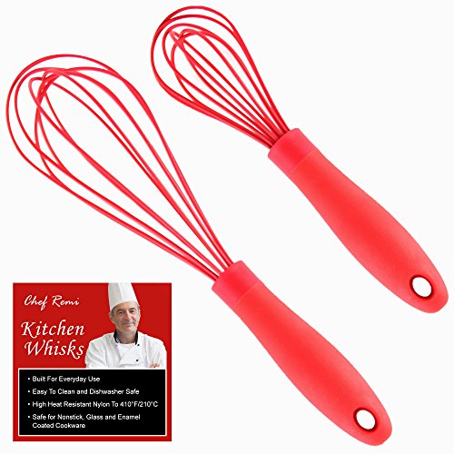 -. Feature : LIFETIME GUARANTEE - The Chef Remi 2-Piece Kitchen Whisk Set comes with a 100% Money Back Lifetime Warranty. If you're not happy or satisfied for any reason, just contact us. Try It RISK FREE Today! / BEST DOUBLE PACK PROFESSIONAL MULTIFUNCTION SILICON WHISKS - Essential, classic cooking accessories available for the home cook or pro chef in restaurants. High performance large 11 inch & small 8 inch teardrop shaped whiskers that are sturdy, stain resistant and won't melt from high temperatures on heater. Will never rust, or scratch skillets or bowls, unlike metal or steel versions. The perfect assistant for all daily cookery tasks in the house, or outside for cookouts, will last a life time. / ERGONOMIC HANDLE DESIGN - Soft, innovative handles designed to give your hands and palms complete comfort and absorb pressure, as well as good grip. Comfortable for anyone who suffers from arthritis of the hands. Mini narrow whisk can be used as a frother for milk, as a whipper for cream, a beater for egg yolks or buttermilk, whisking up vinaigrette, juice etc. Big whisk can be used as a blender or masher for vegetables, for stirring lumps out of sauces or batter etc / MAKES ALL FOOD PREPARATION EASY - Extremely light utensils allows you to be confident in all food prep, such as beating, blending, mixing etc. Use with all dry and wet ingredients. You will love how much easier it is to whip up volumes of fresh egg white, or blend icing sugar into perfect whisper soft icing. Be confident that you'll get no lumps in your mixtures as you stir. Ideal to add into gift basket for weddings, birthdays, Christmas etc / DISHWASHER SAFE AND SPACE-SAVING - Our products are so easy to clean. Just throw into dishwasher, or wash well with soap and water. Whiskset have a handy hanging hole on each whisk for stress-free storage and tidy household. Or store in kitchen drawers as the T-shape flexible coils fit flat into any drawer. Our premium whisks are a must have replacement for your old metal, silver or wooden hardware whisks. These mixers are the best money can buy on USA market.