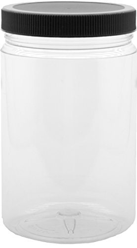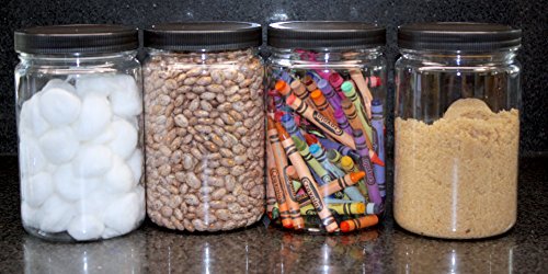 J&S - 32 Oz Plastic Jars with Screw On Lids - 4 Pack - Clear BPA Free PET Quart Sized Storage Containers with Black Sealing Caps