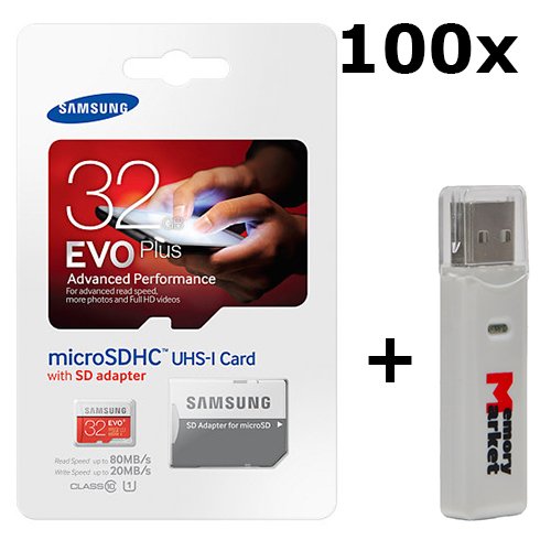 -. Feature : Samsung Evo Plus 32GB MicroSD HC Class 10 UHS-1 Memory Card with Adapter (Retail Package) / 1 year factory warranty / UHS-1 Class 10 Memory Card with read speed up to 80mb/s / MemoryMarket Dual Slot MicroSD and SD USB 2.0 Card Reader / Listing includes: 100x Memory Card, 100x Adapter, 1x Card Reader