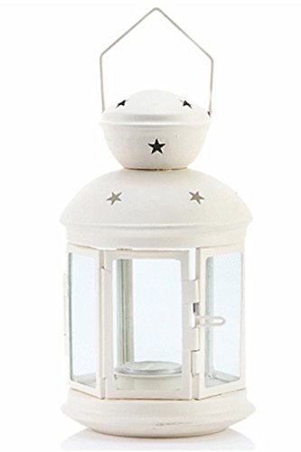 - Structured with cast iron frames, glass panels and star patterned carved finish, which creates an enchanting effect of light and shadow. 4" x 4" x 7" high. (Candle not included)