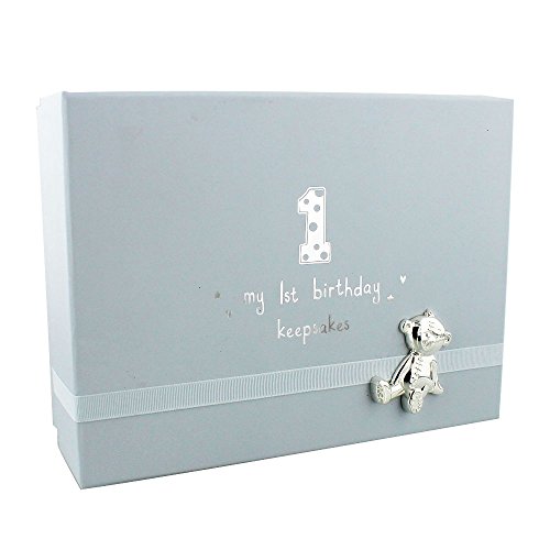 -. Feature : Small blue first birthday keepsake box from Haysom Interiors. / The box has a lovely silver plated teddy bear motif and sheer ribbon feature. / High quality paper finish in a lovely pastel blue shade. / Approximate dimensions: 4" x 10" 7.5". / The perfect gift for a special first birthday.