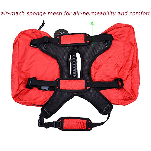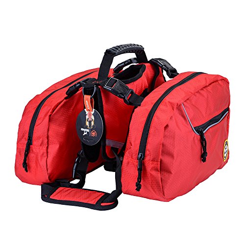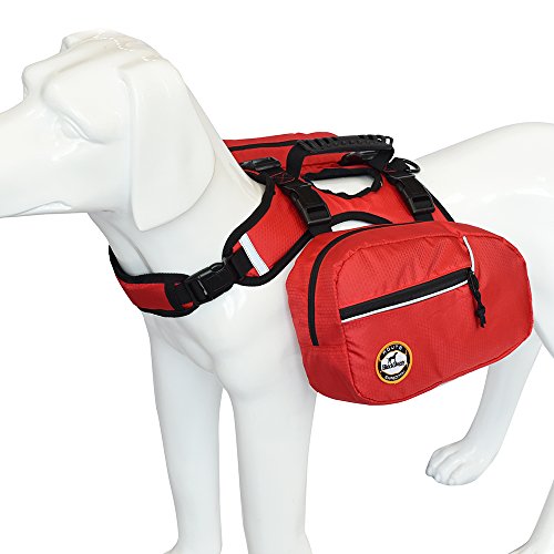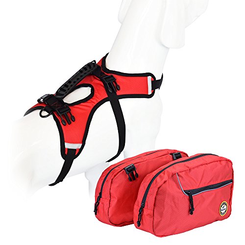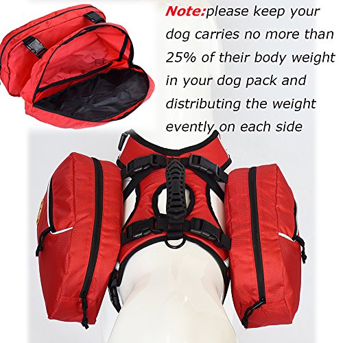 Main Feature: 1)?Outdoor backpack and chest dual-purpose strap. 2) Breathable Backsystem to keep dog more comfortable. 3) The dog harness backpack handle makes it easy to help dogs up and over obstacles. 4) Under low light environment, reflective article is visible, which assure your dog more safety. 5) Ergonomic design distributes weight evenly so your pet is never overly exerted or strained.Please ensure your dog carries no more than 25% of their body weight in their dog pack. 6) Efficient Load: Saddle bag design provides your dog with a comfortable method to carry the essentials for your Trip, Hiking, Camping and 4-pocket backpack can hold water bottles, poop bags, toys, collapsible dog bowls,first aid,etc.