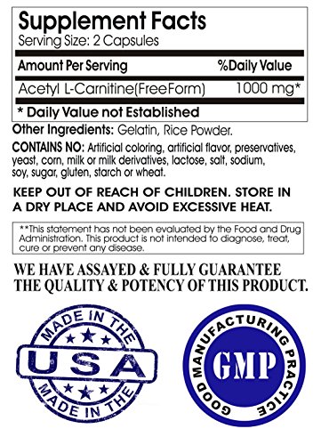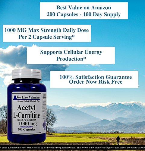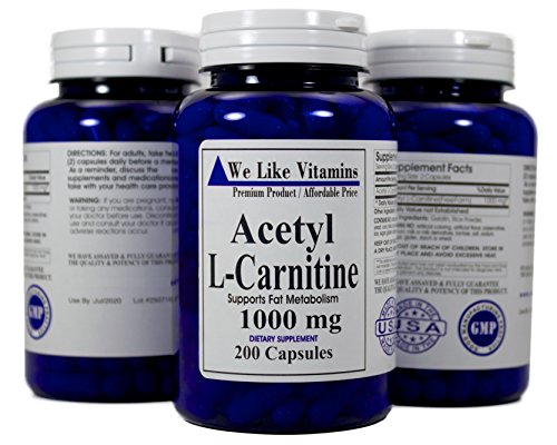 -. Feature : BEST VALUE ACETYL L-CARNITINE 1000MG -200 Capsules- 100 DAY SUPPLY - Each bottle contains 200 Capsules of Pure Acetyl L-Carnitine for a full 100 Day Supply. Most others offer 60 pills or less at a higher P.R.Ice point. With We Like Vitamins Acetyl L-Carnitine you buy fewer bottles and save money / PURE HIGH POTENCY ACETYL L CARNITINE DAILY DOSE - Every serving of 2 capsules delivers 1000MG of Acetyl L Carnitine / 100% Satisfaction Guarantee - If within 30 days your unhappy with your product in any way just send it back to us and we will fully refund your purchase P.R.Ice. No questions asked. ORDER RISK FREE / MADE IN THE USA - All bottles are fresh from the manufacturer in the United States who runs a GMP facility, and have expiration dates up to 4 years from now. Guaranteed to contain no: artificial coloring, artificial flavors, preservatives, yeast, corn, milk or milk derivatives, lactose, salt, sodium, sugar, gluten, starch, or wheat. / SUPPLEMENTING WITH ACETYL L CARNITINE is a great start to a healthier lifestyle