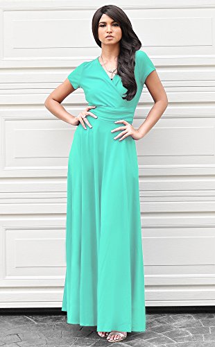 This is an absolutely elegant maxi dress with sleeves from Koh Koh. This design features short cap sleeves and the chest crossover neckline. The dress comes with an elastic mid-waist and a generous empire waist, giving the dress a lovely flowing skirt. This design is very popular with weddings as a bridesmaid dress, mother of the bride or mother of the groom dress and also some customers have used the white or ivory color as an understated wedding dress.These versatile maxi dresses are available in many sizes, it really does make a wonderful plus size maxi dress.