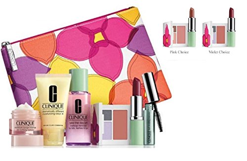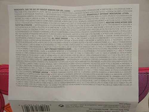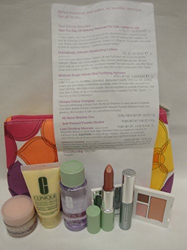 -. Binding : Misc. -. Brand : Clinique -. EAN : 0020714726126 -. Feature : Moisture Surge Intense Skin Fortifying Hydrator (15ml), Take The Day Off Makeup Remover (50ml) / Dramatically Different Moisturizing Lotion+ (30ml), Lash Doubling Mascara in Black (3.4ml) / Clinique Colour Compact: Eye shadow duo (.03oz / 1g) plus blush (.06oz / 1.8g) in an exclusive compact ( Pink Set ) / Pink Set includes All About Shadow Duo in Strawberry Fudge + Soft-Pressed Powder Blusher in Pink Blush plus Different Lipstick in Think Bronze / Cosmetic bag -. NumberOfItems : 1 -. PackageQuantity : 1 -. ProductGroup : Beauty -. ProductTypeName : BEAUTY -. Title : NEW Clinique Skin Care Makeup 7 Pc Gift Set Travel Size Pinks Spring 2015 Value $70 -. UPC : 020714726126