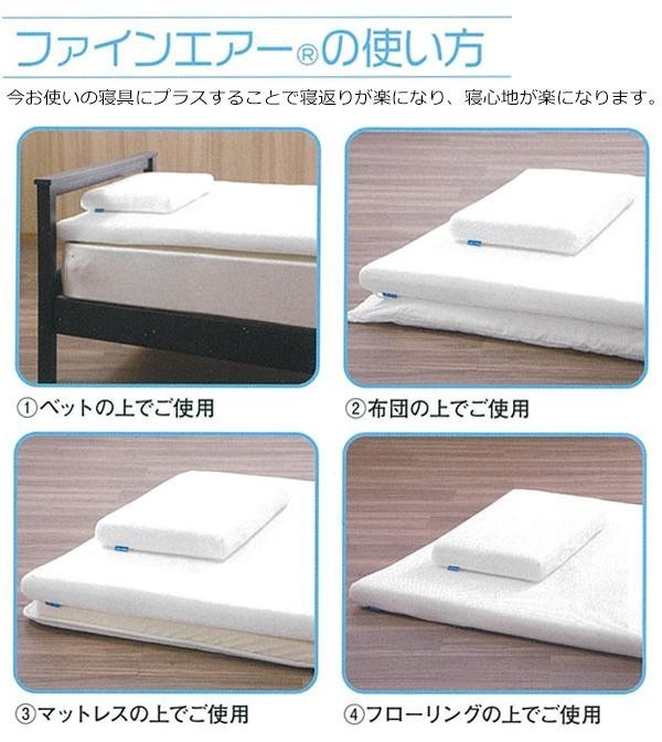 | ファインエアーシリーズのスタンダードモデルです。中材で使用されている「エアーラッセル」は、底つきしない特殊な構造で、高い通気性と優れた体圧分散性が特徴です。側地はメッシュ素材で通気性もよく、洗濯も簡単です。 |