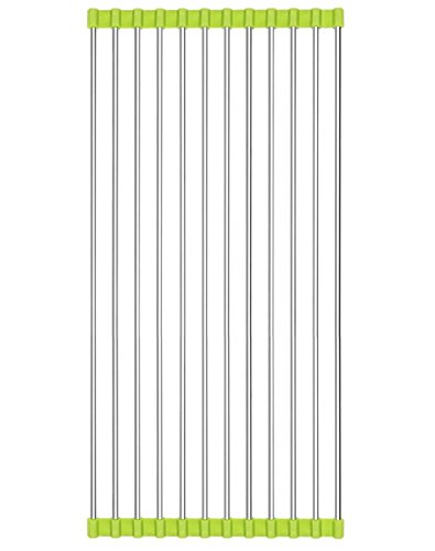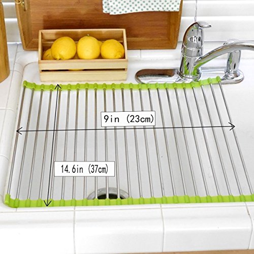 Hyacinthus Kitchen Over the Sink Roll Up Drying Rack Drainer for Dish Cup and Tableware Multifunction Rollable Easy to Storage Stainless Steel with Silicone Mat (14.6 IN, Green)