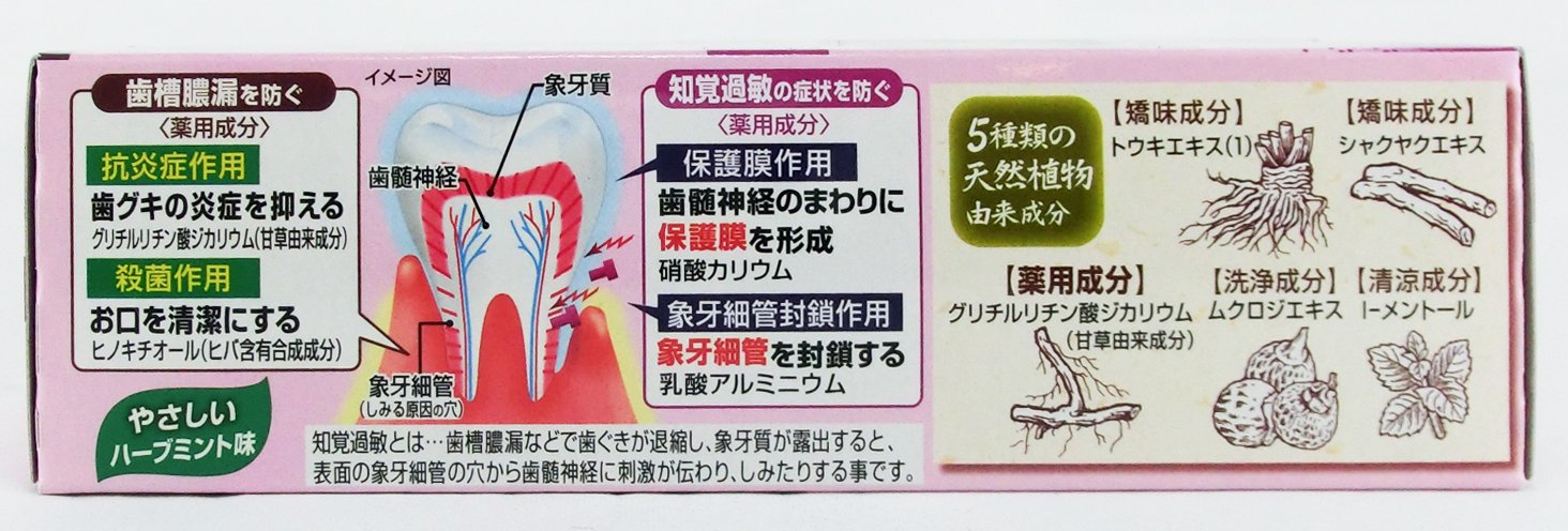 ● Prevents alveolar pyorrhea with 5 kinds of natural plant derived ingredients ● Hinokitiol is sterilized, dipotassium glycyrrhizinate prevents inflammation and prevents alveolar pyorrhea ● Potassium nitrate · Aluminum lactate is hyperalgesia and teeth blotch