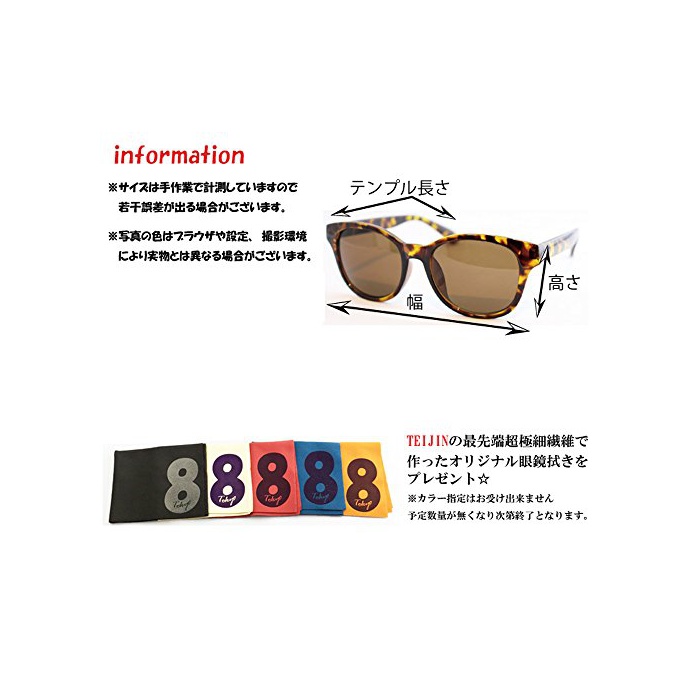 【eight tokyo】유행 발신원,도쿄에서 탄생 했 eye wear 브랜드 썬글라스를 중심으로 수 많은 안경을 다루고 있습니다.당브랜드는 안경의 본고장,후쿠이현 사바에시의 안경 메이커와 함께 일본인에게 어울리는 아이템을 디자인,기획을 하고 있습니다.동그라미(라운드)안경이나 검 ##고, 대모갑(차)의 다테 안경(클리어 렌즈)등 패션 아이템으로서는 물론,눈(째)의 보호나 화분증(꽃가루 알레르기) 대책,편광 렌즈등도 수없이 갖춰 있습니다. 맨즈도 레이디스도 심부름꾼 받을 수 있는 남녀 겸용 사이즈 입니다.