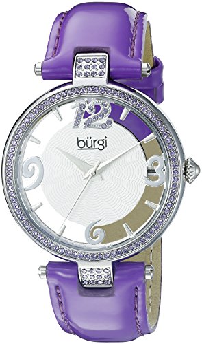 Studio : TWI Watches, LLC Publisher : TWI Watches, LLC Binding : Watch Product Description This lovely women's timepiece by Burgi showcases an elegant 38mm case design with a silver tone finish. The bezel and lugs are filled with sparkling purple Swarovski crystals, giving this watch a beautiful shine. One of the finest points of this watch is the dial; it is floated by the numerals, giving it the appearance of a classic skeleton timepiece even though its powered by a Miyota quartz movement. The case is adorned with a purple genuine leather strap with glossy finish. 0