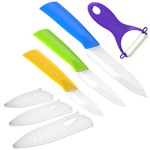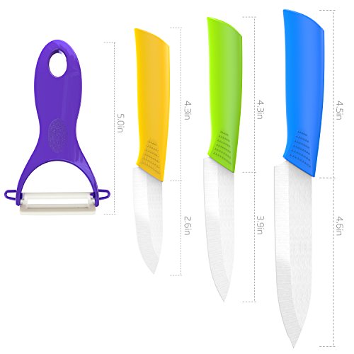 1.MULTI COLOR CERAMIC CUTLERY --- ceramic cutlery knife set have 3 different color and different size knifes they are in different use and 1 chef knife peeler importantly this set have 3 scabbard to protect your cutlery,of course, you can also treat it as a home artwork.