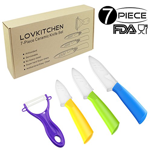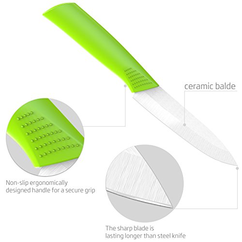 4.LIGHT WEIGHT EASY TO USE --- Withe the ceramic material our knife set is very light, the handle is really convenient and safe for you to use,these tools can be used by old man children and adult ,i believe your family will love them.