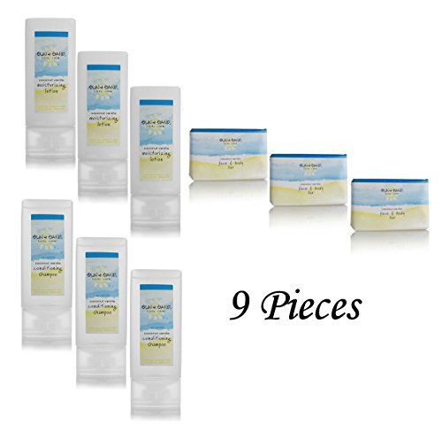 - 9 Piece set includes 3 Conditioning Shampoos (0.8 oz), 3 Moisturizing Lotions (0.8 oz), and 3 Facial Soap Bars (0.75 oz)