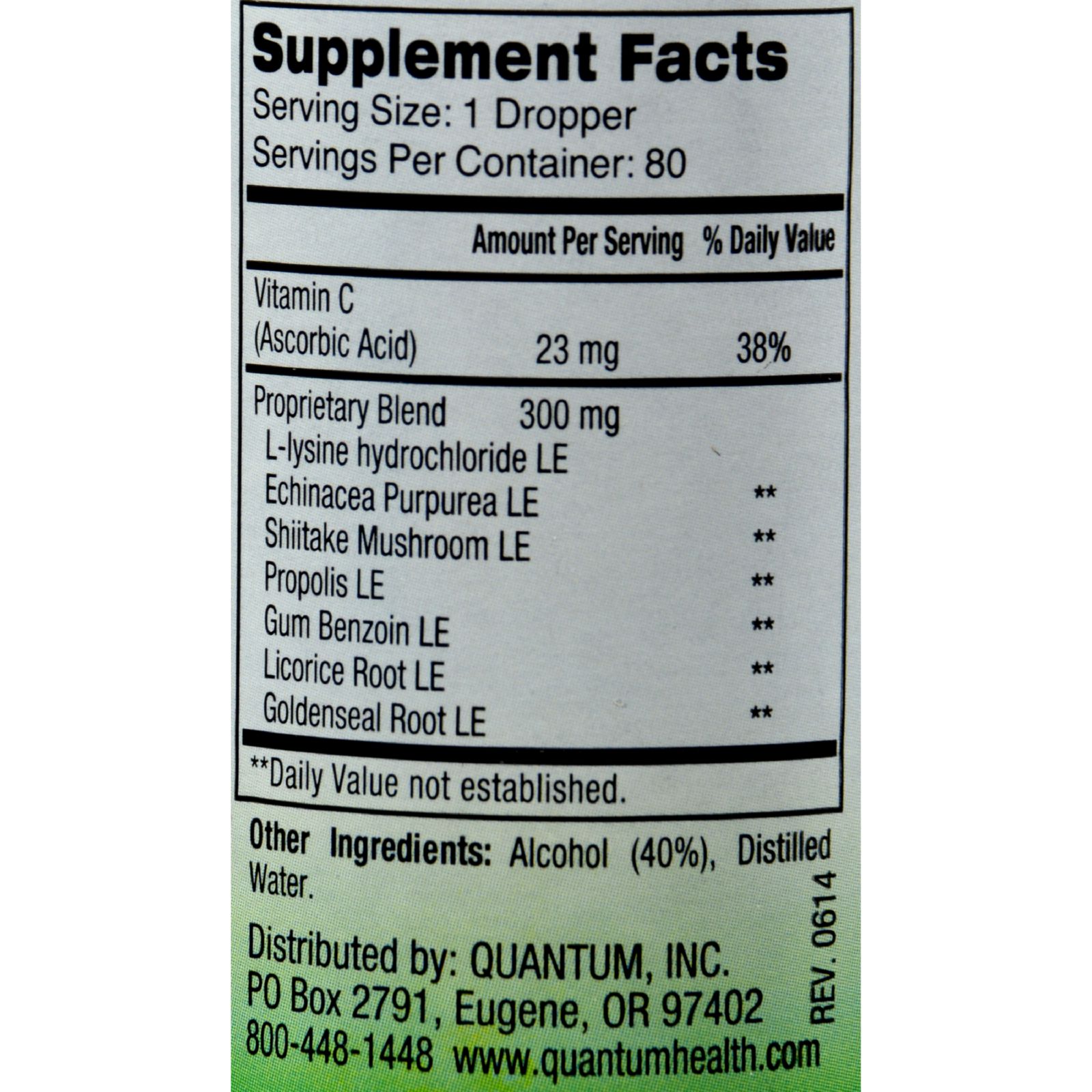 | Quantum Super Lysine Plus Liquid Extract Description: Immune Strengthener Cold Sore and Herpes Relief This powerful system strength booster with Lysine, Echinacea extract and the powerful cell-restoring nutrient LEM, goes to work instantly! Along with potent doses of Licorice Extract, Goldenseal Root and Vitamin C, our herbal formula also contains the powerful cell-restoring nutrient LEM: a concentrated Shiitake Mycelium Extract rich in polysaccharides. For those who don't like taking pills, Super Lysine Plus + Liquid is the perfect choice. Disclaimer These statements have not been evaluated by the FDA. These products are not intended to diagnose, treat, cure, or prevent any disease. Ingredients : Lysine, Echinacea Extract (Echinacea purpurea), Shiitake Mushroom extract (Lentinus edodes), Propolis Liquid Extract, Gum Benzoin Extract (Styrax Benzoin extract), Licorice Extract (Glycyrrhiza glabra), Goldenseal Root Liquid Extract (Hydrastis canadensis), Vitamin C (Ascorbic Acid). Size : 2 FZ Pack of : 1 Product Selling Unit : each |