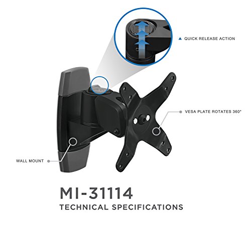 -. Binding : Personal Computers -. Brand : Mount-It! -. Feature : Quick mount & quick mode release design with easy to use quick connect mechanism; Maximum productivity and ergonomic comfort. / Wall mount type. Supports up to 33lbs (15kgs); Tilt: 105°; Rotation: 90°; Swivel: Max 180°; Mounting Pattern: VESA compliant: 75x75 and 100x100 / Swift and easy movements and adjustments. Space saving with its compact design. / Maximum adjustment rendered by tilting, swiveling, pivoting and rotation. / Solid Aluminum die-cast construction; Neat and efficient cable management; Easy installation and removal of monitor. -. Label : Mount-It! -. Manufacturer : Mount-It! -. Model : MI-31114 -. MPN : MI-31114 -. PackageQuantity : 1 -. PartNumber : MI-31114 -. ProductGroup : Personal Computer -. ProductTypeName : COMPUTER -. Publisher : Mount-It! -. Studio : Mount-It! -. Title : Mount-It! Premium Monitor Wall Arm With Quick Release
