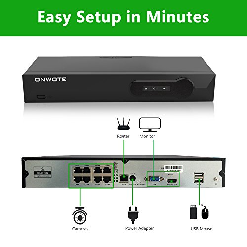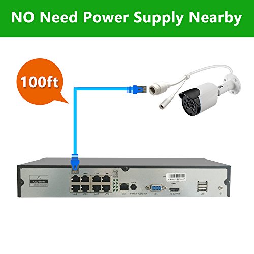 【POE, Plug n Play】-- This security system features Power over Ethernet (PoE) technology, a single network cable run between your NVR and each IP camera provides both power and video transmission, allowing you to position your cameras anywhere without the need for a nearby power outlet.