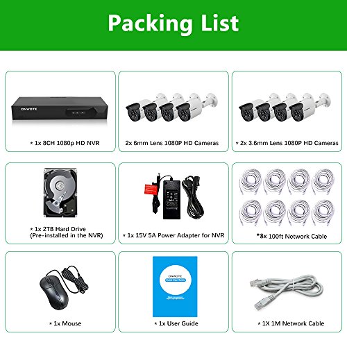 ONWOTE 1080P HD IP PoE Security Camera System 8 Channel NVR with 2TB Hard Drive and 8 Indoor/ Outdoor Night Vision 2.0 Megapixel Video Surveillance Cameras and 100ft Pure Copper CAT5 Ethernet Cables