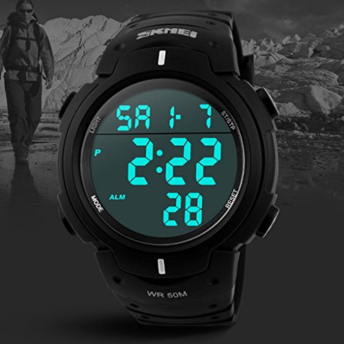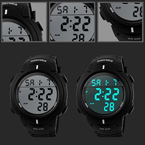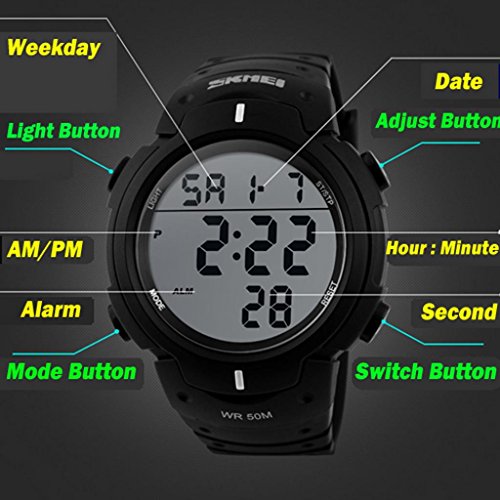 -. Feature : Simple design big LCD sreen display / Time, date, week, alarm clock, stopwatch, LED backlight / Fashionable sporty dial design, military style outlook / Black rubber strap, comfortable to wear / 3 ATM water resistance, convenience in your daily & sporty life