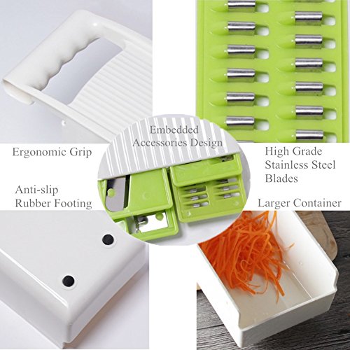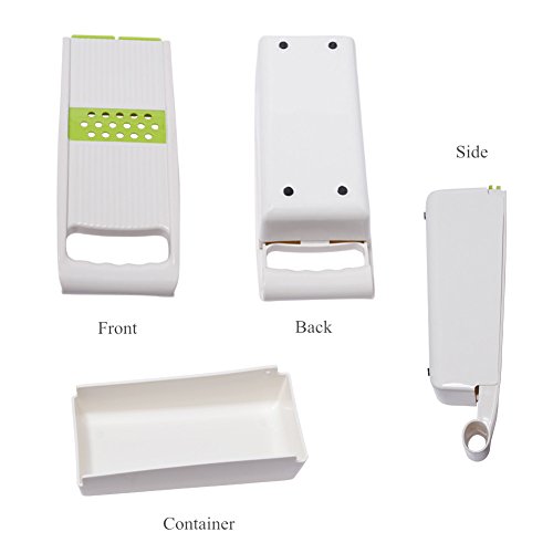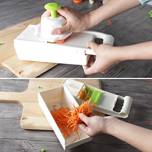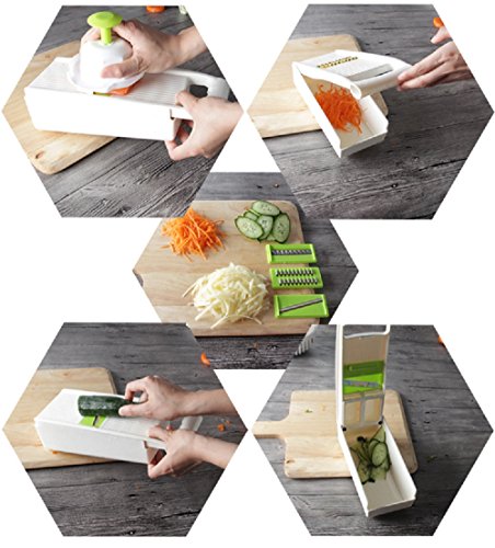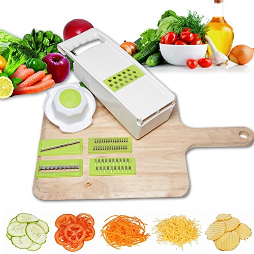 - MULTTIPURPOSE 5 BLADES CREATE PERFECT CUT: Vegetable Slicer, Vegetable Grater, Fine Grater, Coarse Cheese Grater and Potato Waving Slicer! This Multi-Purpose Mandoline Slicer is Excellent for Using as a Vegetable Cutter, Vegetable Peeler, Vegetable Chopper, Cheese Grater & Carrot Grater!