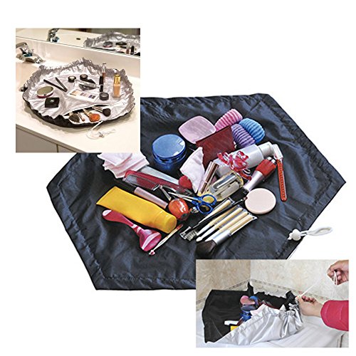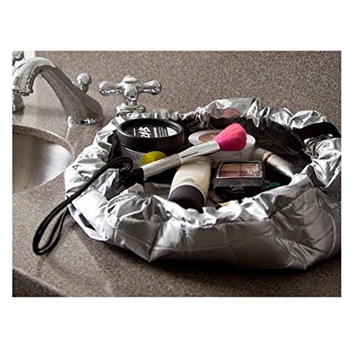- Opens up to a large hexagonal shape of 19" x 22" Double Sided Bag. Can be turned inside out to use either Silver or Black Also contains a zippered compartment on the silver side that runs down throughout the entire inside space of the bag, holding enough room to fit several brushes. Has one drawstring. Cosmetic bags with two drawstrings tend to be more cumbersome to close. .
