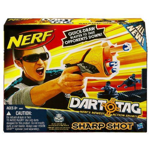 -. Binding : Toy -. Brand : Nerf -. Color : yellow,orange,gray -. EAN : 0653569442417 -. Feature : When your opponent is in sight, grab your blaster and send your Dart Tag darts flying - they'll even whistle as they fly / Blast your way to victory / Air-powered, quick-draw blaster helps you take your opponents down before they know what's hit them / Belt clip's easy release lets you make your move fast / Blaster comes with quick-release belt clip and 4 Dart Tag darts -. IsAdultProduct : 0 -. Label : Nerf -. Manufacturer : Nerf -. Model : 28507 -. MPN : 8872200 -. NumberOfItems : 1 -. PackageQuantity : 1 -. PartNumber : 8872200 -. ProductGroup : Toy -. ProductTypeName : TOYS_AND_GAMES -. Publisher : Nerf -. Studio : Nerf -. Title : Dart Tag Sharp Shot -. UPC : 653569606338