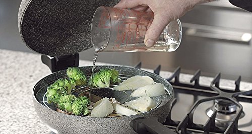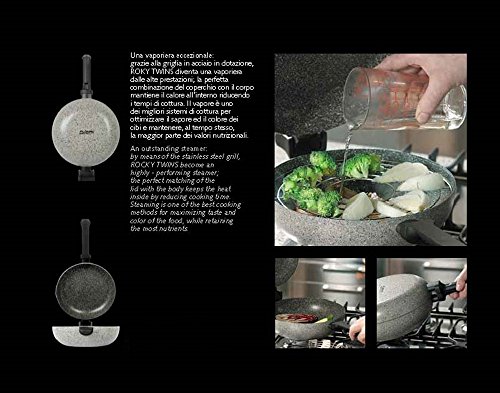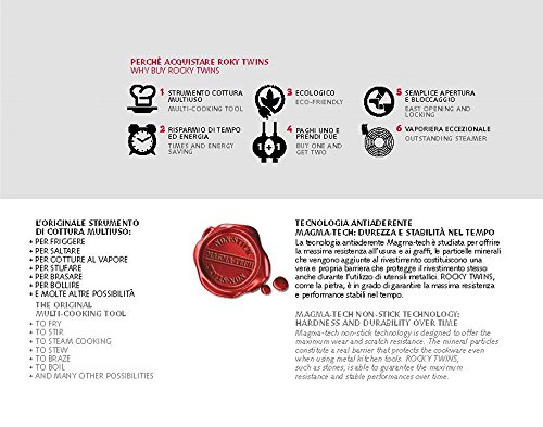 by means of the stainless steel grill, ROCKY TWINS become an highly - performing steamer; the perfect matching of the lid with the body keeps the heat inside by reducing cooking time. Rocky Twins is compatible with all the cooking surfaces. It consists in applying the magnetic bottom simultaneously with the forging operation.