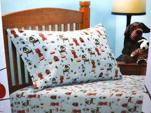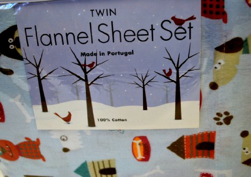 - Feature : 100% Cotton Flannel 3-Piece Twin Sheet Set made in Portugal / Whimsical pattern and design. Floating on a light blue back ground are dogs, doghouses, bones, dog dishes, stars and paw prints in bright orange, blue, brown, and touches of yellow. / White dogs, brown dogs, tan dogs, orange dogs with silly faces sure to make any dog lover smile! / Such a delightful set. Warm and comfy, snuggle into these sheets, and go to sleep and wake up surrounded by these delightful animals. Perfect for those chilly fall and winter nights / Each set comes with one twin flat sheet 68" x 99", one fitted sheet 40" x 78", 1 standard pillowcase 20" x 31". Wash before using in warm water, tumble dry medium, non-chlorine bleach.