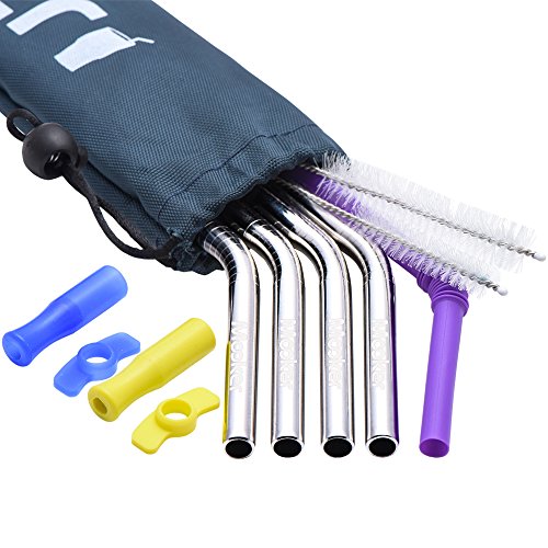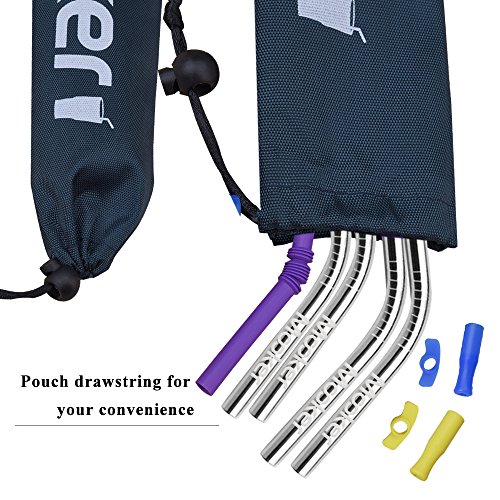 - SET OF 4 REUSABLE STRAWS - Look cool and care for the planet with Mooker's eco-friendly reusable drinking straws! Includes 4 stainless steel straws (L: 9.5"/10.5" W: 0.27"), 1 purple plastic reusable straw, 2 cleaning brushes in different lengths, and 2 sets of silicone tips - all housed in a cute, handy navy nylon Oxford pouch.