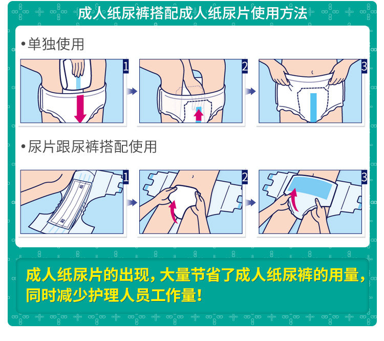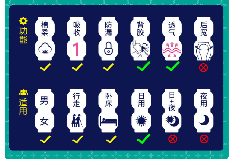 适用人群:能自己上厕所,轻度及中度失禁人群,1次尿量级别相当于普通成人拉拉裤的吸收量,白天使用为主,或垫于成人尿裤中使用减少成人尿裤用量。尺寸稍长也比较厚,适合绝大多数人使用,也适合量大的经期妇女或产妇替代夜用卫生巾。
