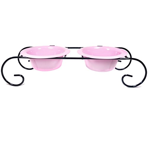 Studio : Platinum Pets Publisher : Platinum Pets Binding : Misc. Product Description The Platinum Pets Low-Feeding Scroll Feeder features a classic scroll design to hold your lovable short-legged pet's favorite meal. The feeder is crafted with handforged wrought iron into a low scroll-shaped structure and powder coated in a FDA compliant gloss black finish. Your pet's meal will be held by two wide rimmed bowls tastefully embossed with paws. The bowls are dishwasher safe and powder coated in a multitude of foodsafe electric colors to guarantee against rust. Bowls are measured in fluid ounces and are rounded up to quart sizes. 0